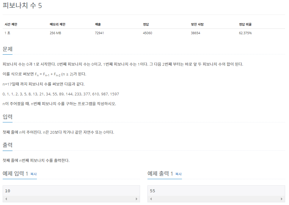 이 문제에서는 n의 값을 입력하고, n번째의 값을 출력해주는 문제로, 배열을 하나 생성하여 arr[0]=0 , arr[1]=1, 그 이후의 값은 arr[n-2] + arr[n-1] 이 되고, 최종적으로 입력받은 값 n에 대한 arr[n]의 값을 출력하면 됩니다. 코드로 작성하면 아래와 같습니다.