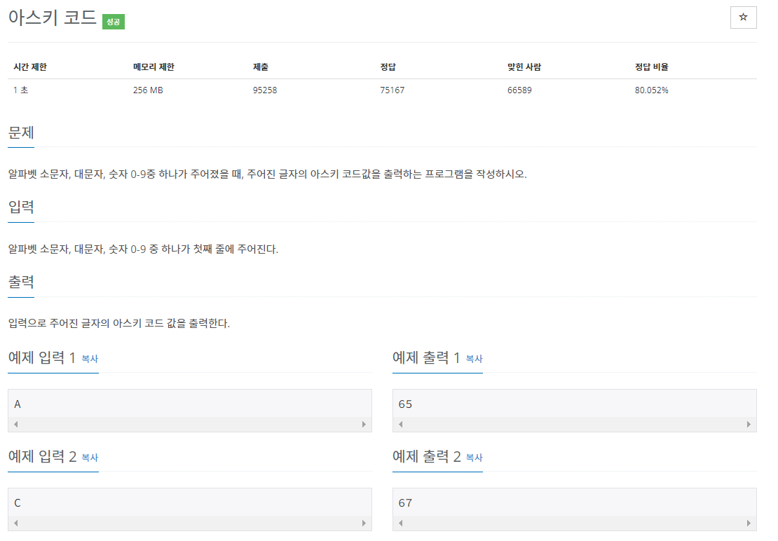 이 문제는 이러한 아스키코드를 이용하여 어떠한 문자(대/소), 숫자를 입력하였을 때 그에 해당하는 순번(숫자)를 결과값으로 출력하는 문제입니다. 굉장히 간단하게 풀 수 있는 문제로 입력받은 char 문자를 정수(int)형으로 출력해주면 그에 대한 아스키코드 순번이 출력됩니다.