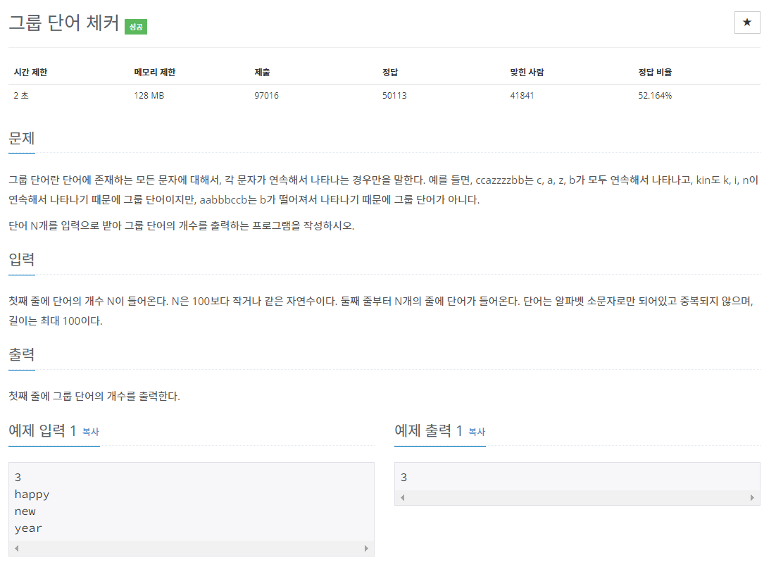 이 문제는 각 단어가 떨어져서 중복되지 않는 (즉 그룹을 지을 수 있는) 단어가 몇 개인지를 출력하는 문제입니다. 여기서 고려해야 할 사항은 두 가지가 존재합니다.