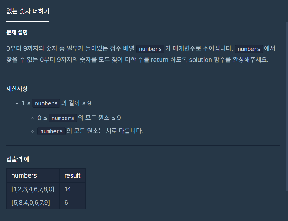 이 문제는 먼저 0~9까지의 숫자 중 numbers 리스트에 존재하지 않는 수를 찾아야 하므로, 0~9까지 반복하는 동안 numbers 리스트의 값들과 비교하기 위해 이중 for문을 이용하여 비교를 진행하였습니다.