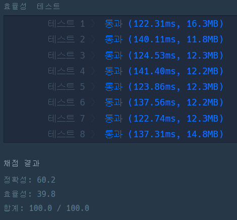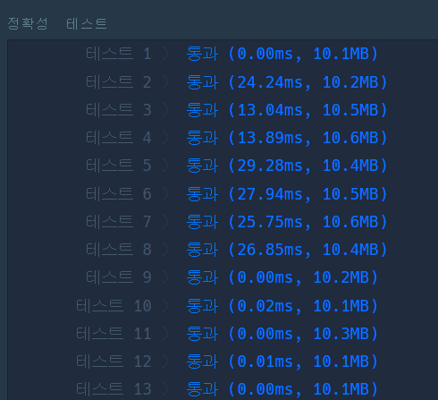 위와 같이 풀이를 진행하니 모든 테스트가 통과되는 것을 확인할 수 있었습니다.