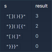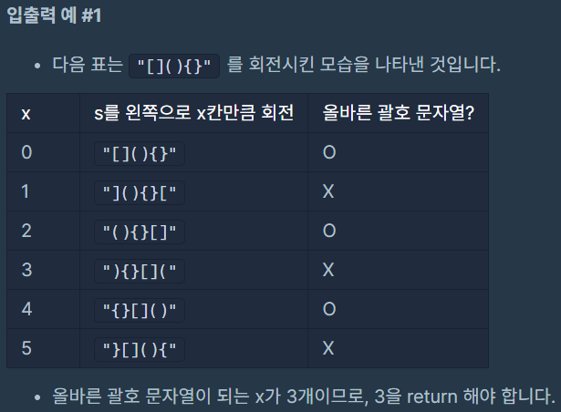 대괄호, 중괄호, 그리고 소괄호로 이루어진 문자열 s가 매개변수로 주어집니다. 이 s를 왼쪽으로 x (0 ≤ x < (s의 길이)) 칸만큼 회전시켰을 때 s가 올바른 괄호 문자열이 되게 하는 x의 개수를 return 하도록 solution 함수를 완성해주세요.