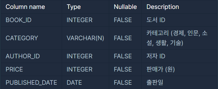 BOOK 테이블은 각 도서의 정보를 담은 테이블로 아래와 같은 구조로 되어있습니다.
