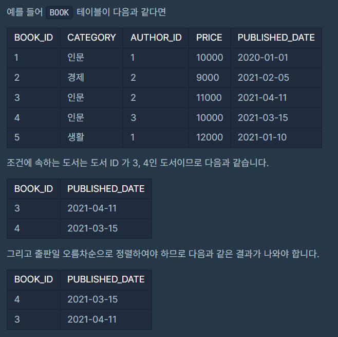 3. 출판일을 기준으로 오름차순 정렬한다. -> ORDER BY 로 오름차순 정렬