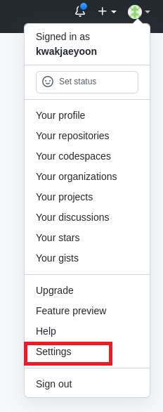 그 다음은 github으로 들어가 우측 상단을 클릭한 후 setting을 클릭합니다.
