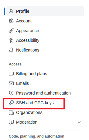 좌측 메뉴에서 SSH and GPG keys 를 클릭합니다.