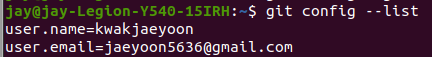 이름과 이메일이 제대로 설정되었는지 작성한 list를 확인해 줍니다. 이 과정에서 설정한 정보 중 일부분만 보고 싶으면 git config [user.~~] 의 형식으로 작성해 주면 내용을 확인할 수 있습니다.