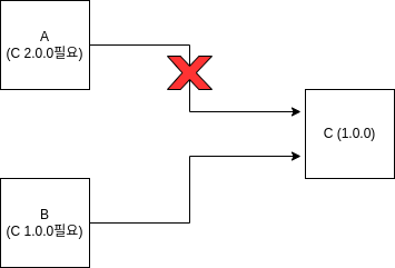 그런데 여기서 A라는 프로그램은 C프로그램의 2.0.0 버전이 필요하고, B라는 프로그램은 C프로그램의 1.0.0 버전이 필요하다면, C라는 프로그램은 동일 컴퓨터내에서 여러 버전을 설치할 수 없기 때문에 A와 B 둘 중 하나는 정상적인 실행을 보장할 수 없습니다.