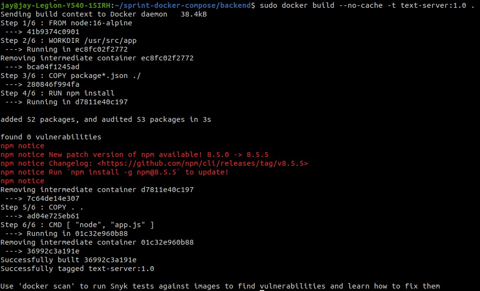 이 과정까지 끝나고 docker build를 하게 되면 이미지가 생성이 됩니다. 여기서 캐시를 비활성화 하려면 --no-cache를 추가하면됩니다.