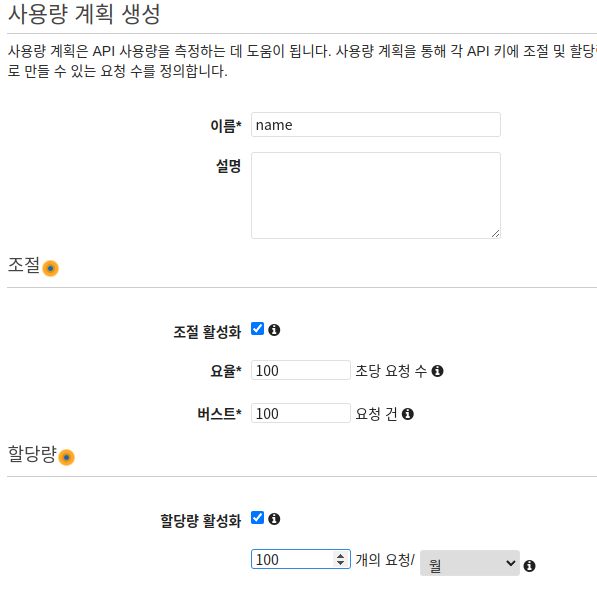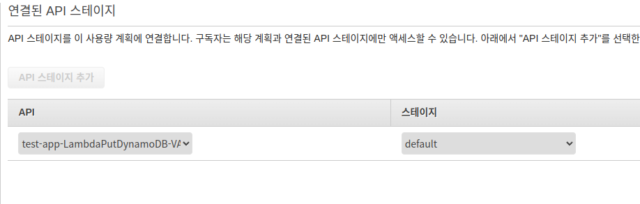 API key 생성이 완료되면 해당 key에 대한 사용량 계획을 추가해줍니다.