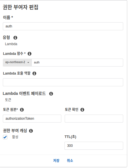 API gateway에서 권한 부여자로 가서 권한 부여자 생성을 클릭해서 다음과 같이 생성해줍니다.(필자는 미리 생성해놓은 것이 있어 화면 대체)