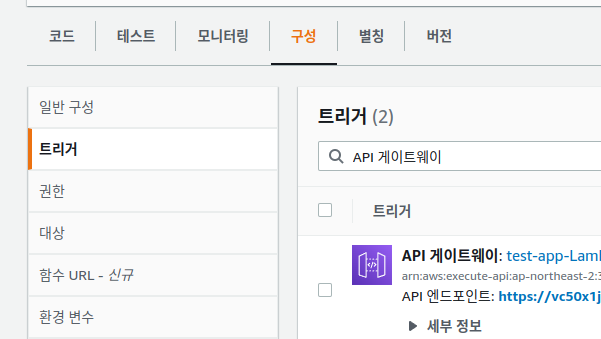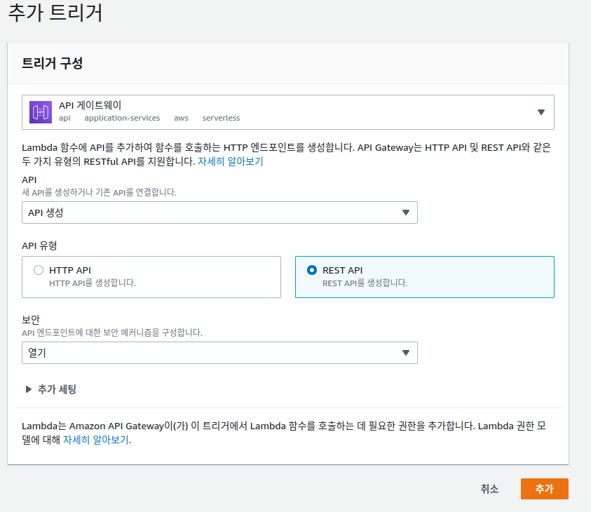 Lambda의 함수 에서 방금 추가한 함수로 들어와 트리거 추가를 해주고 다음과 같이 설정해줍니다.